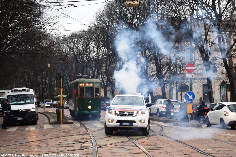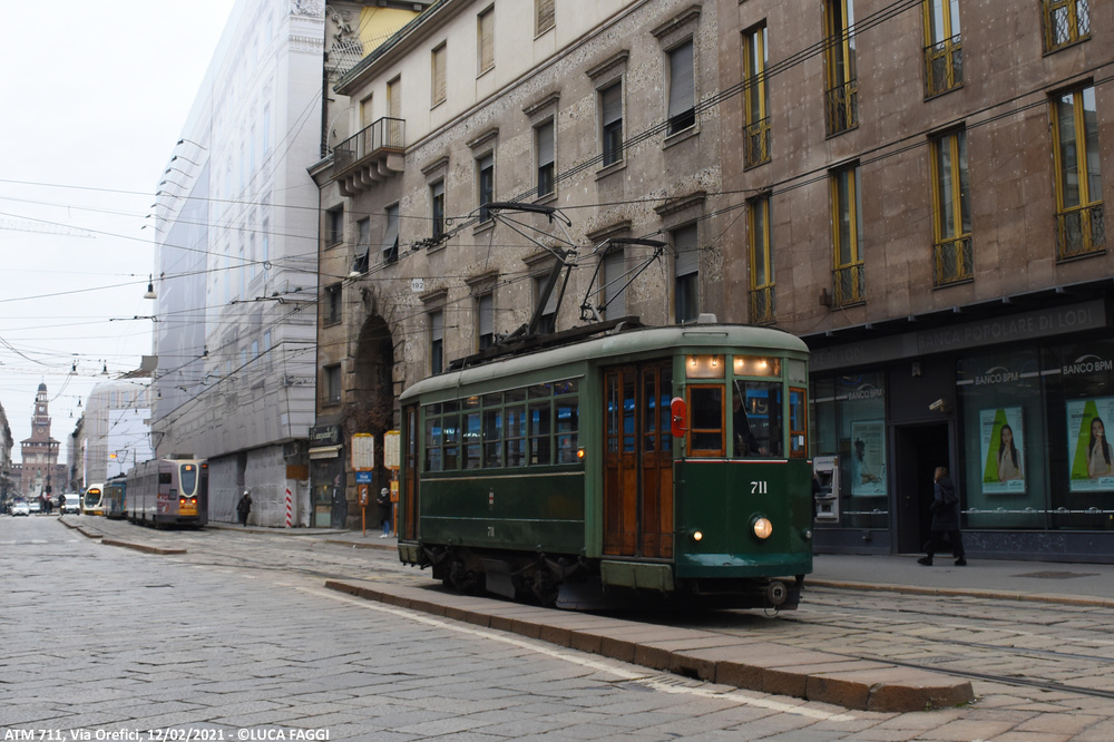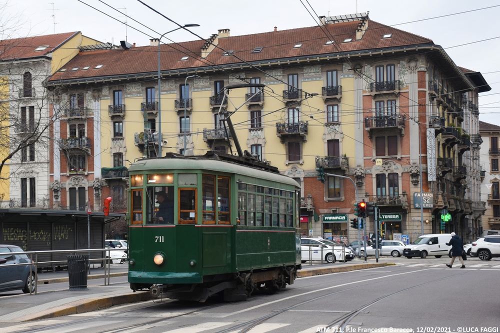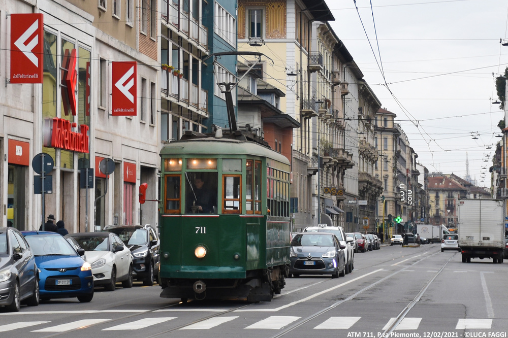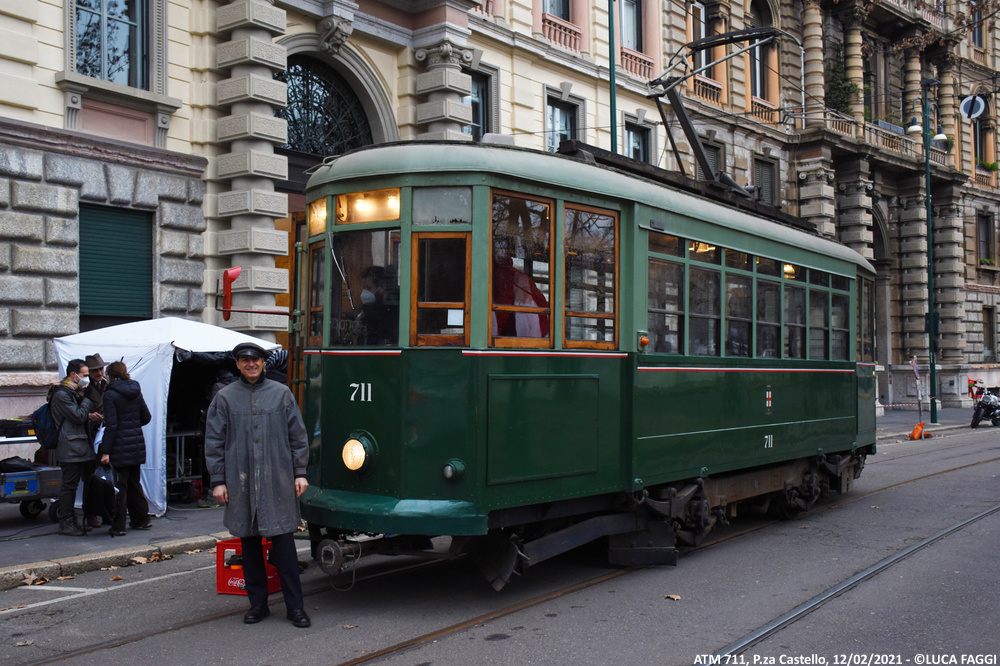 A seguito del trasferimento trainato dal deposito Precotto al deposito Baggio il precedente 5 agosto 2020, la motrice 711 è stata impiegata per comparire in alcune scene a sfondo cittadino sul set del film “I Fratelli De Filippo“, diretto dal regista Sergio Rubini ed incentrato sulla vita di Peppino, Titina ed Eduardo De Filippo. Giunta in Piazza Castello la mattina del 12 febbraio 2021, tra la foschia della giornata invernale ed un sole nascosto dalla magia del grigiore meneghino, è rimasta coinvolta nelle sequenze che la vedono immortalata esternamente ed internamente in movimento tra Foro Buonaparte, Cairoli e la piazza dove capeggia la storica fortezza. Le riprese iniziate alle prime luci dell’alba, si sono concluse verso le 10:30 quando la vettura è poi rientrata autonomamente al deposito Baggio.
