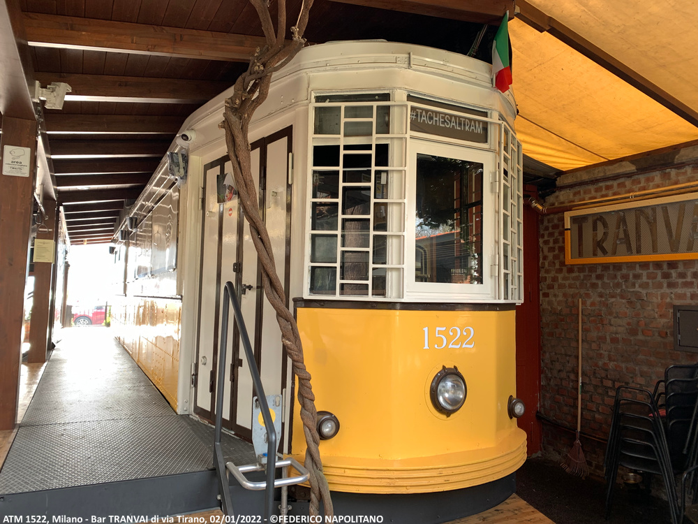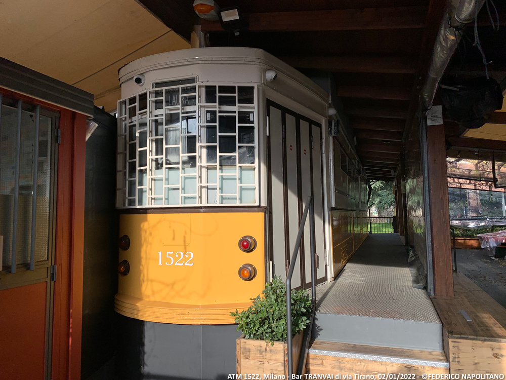 Curiosità: Il tram venne acquistato negli anni ’90 per una cifra pari a 2 milioni di lire al solo scopo di dare vita ad un’idea originaria dell’anziano signor Giovanni Iannuzzi, ovvero, aprire un piccolo chiosco sulla Martesana. Per creare qualcosa di originale, egli domandò all’Azienda dei Trasporti comunale la possibilità di acquistare di una classica vettura tipo 1500. ATM approvò la richiesta e selezionò per la cessione l’unità 1522, ferma dal 1990. A seguito di problemi burocratici, il vecchio tram rimase per una decina di anni “con le quattro frecce” in attesa della collocazione finale, per poi aprire al pubblico come bar nel 2000. Nel 2017 il timone del locale passò ad un gruppo di giovani intraprendenti, tutti residenti nel quartiere ed affezionati al quartiere milanese, molto suggestivo. Con impegno, passione e dedizione hanno restaurato la vettura e rilanciato l’attività ampliandola in un vero e proprio bistrot unico al mondo. Ad oggi il bar è aperto nei periodi primaverili-estivi ed e creando una grande attrazione riqualificando una zona per anni rimasta periferica e poco considerata anche da un certo tipo di avventori più raffinati.