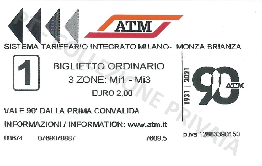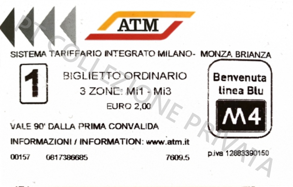 Emissioni speciali ATM Milano – STIBM 90 ANNI ATM Biglietto in vendita dal 15 al 30 maggio 2021 Biglietto “90 anni ATM” – fronte Biglietto “90 anni ATM” – retro BENVENUTA M4 Biglietto “Benvenuta M4” – fronte Biglietto “Benvenuta M4” – retro