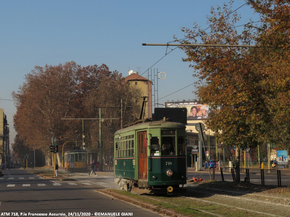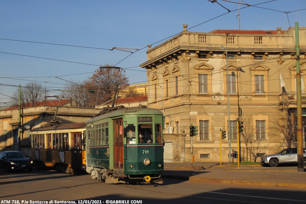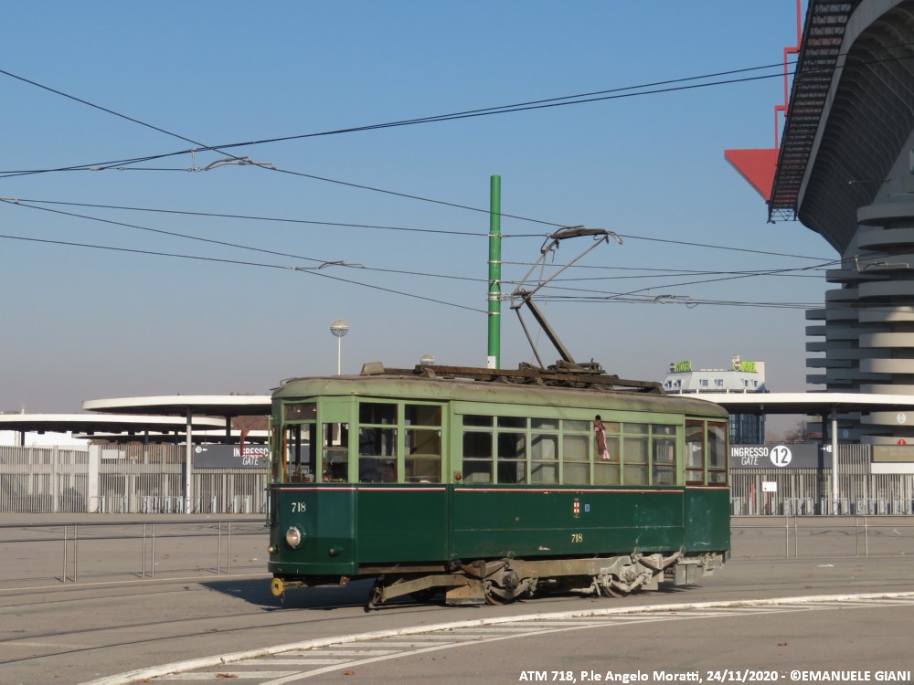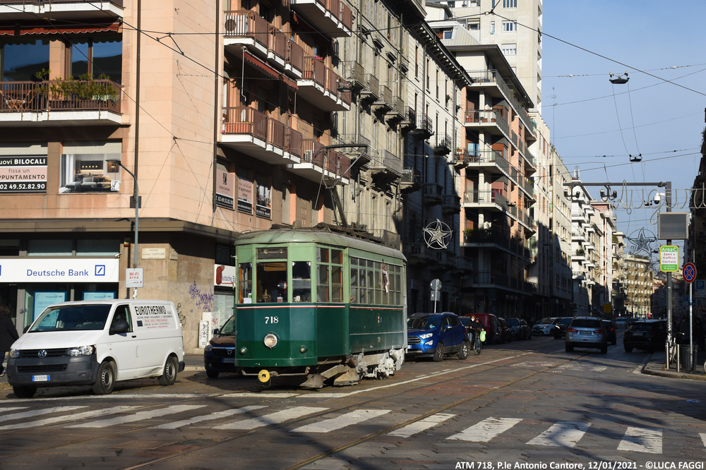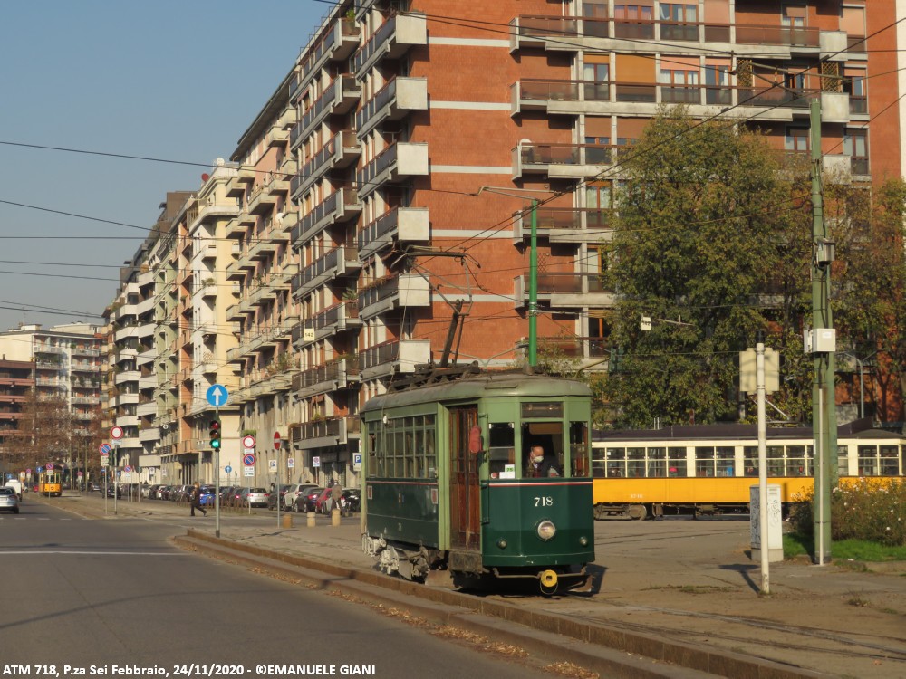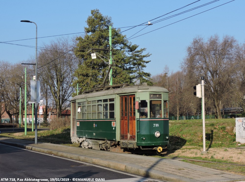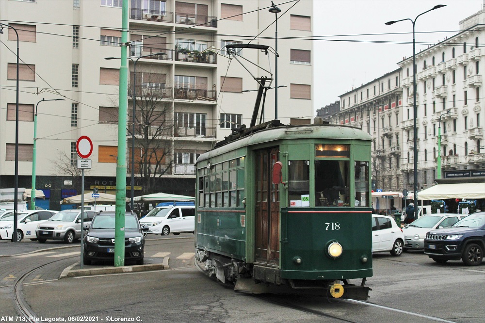 La vettura 718 è stata costruita alla fine degli anni ’40 dai resti della ex 666, danneggiata dai bombardamenti della Seconda Guerra Mondiale, per prestare servizio di linea. Verso la fine degli anni ’60 è stata convertita in sabbiera, ruolo che ha svolto fino al 2021. Nel 2022 ha ricevuto una piccola revisione in seguito ad uno svio che ha previsto anche una rinfrescata alla livrea, operazione mai conclusa. Attualmente la vettura è accantonata presso il deposito Leoncavallo. La vettura presenta una curiosa colorazione gialla del gancio di traino fuori ordinanza.